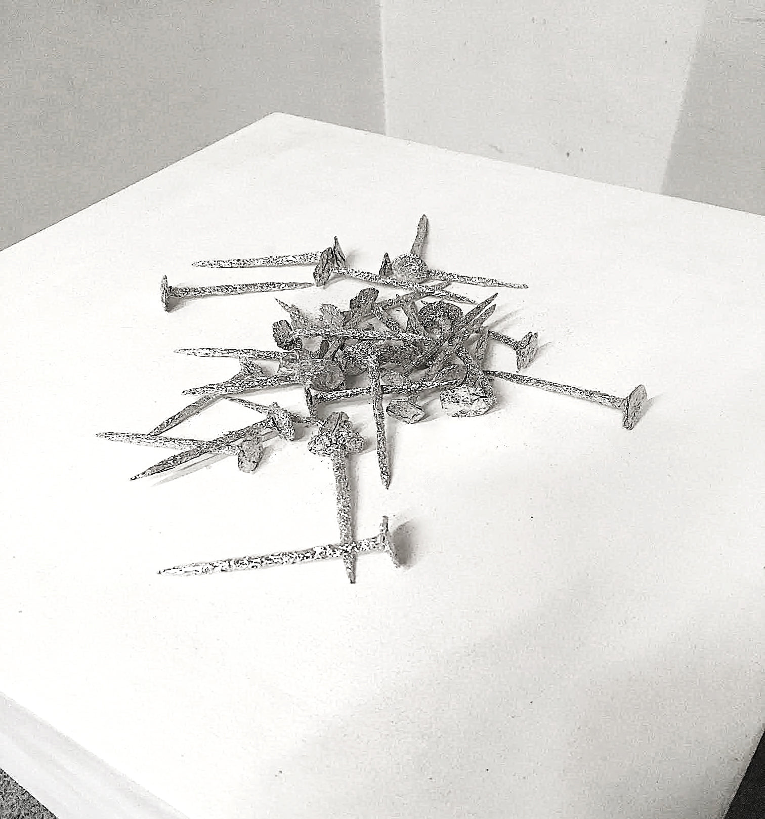 Untitled (Cross), 2016, plinth, aluminum foil, 108x40x40 cm. Exhibited in group show Que Farei Eu com esta Espada?, curated by António Caramelo, Zaratan – Arte Contemporânea, Lisboa, 2017