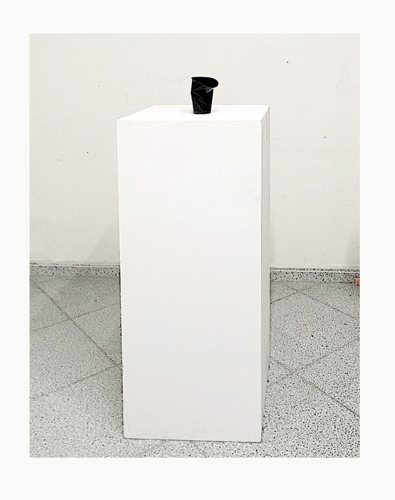 Untitled (Thank You), 2017, 3 acrylic glasses, 25x11x12 cm, 3 plinths, variable dimension. Installed in group show “Them or Us”, curated by Paulo Mendes, Galeria Municipal do Porto, Porto, 2017.